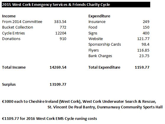 We are now looking for applications from West Cork charities to be beneficiaries of the 2016 cycle. Please email wcorkemscycle@gmail.com for an application form.